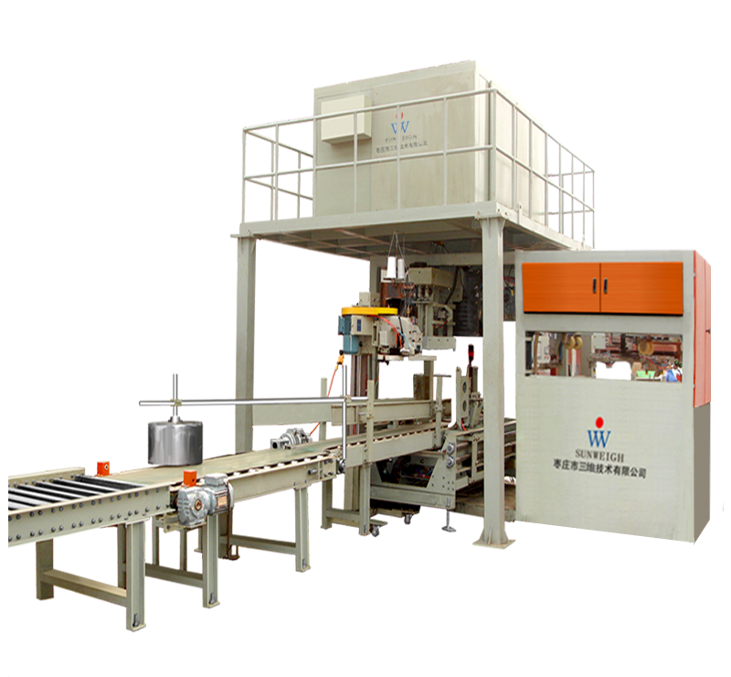 粉劑全自動包裝機型號SW-ABF-800,該款全自動包裝機主要有自動上袋機構、稱重機構、送料機構、機體框架、控制系統、除塵單元、技術檢測單元、折邊縫包機構、輸出機構等組成。自動上袋機構自動將包裝袋碼齊,通過觸手吸盤將包裝袋拾起移動到上袋機構處,上下吸盤將包裝袋打開,上袋機械手將包裝袋夾住,移動機械臂將包裝袋自動套在下料口處,檢測裝置檢測到包裝袋,夾袋夾自動將包裝袋夾緊,稱重機構通過PLC控制系統在接收到套袋完成信息后,自動將稱量好的物料填充到包裝袋內,送料機構繼續對稱量機構送料,同時金屬檢測機構檢測物料中是否存在金屬物質,根據檢測的結果決定是否執行下一個包裝環節,有則自動剔除,沒有則等待完成下一批次的包裝。控制系統在接收到物料填充完畢后,等待除塵機構將在包裝過程中造成的粉塵處理掉后,發出信號,夾袋夾將包裝袋放下,抱袋小車將包裝袋移動到折邊機處進行折邊作業,同時縫包機將折好邊的包裝袋自動縫包斷線,完成包裝環節。輸送機將包裝好的包裝袋輸送到拍打機構自動對包裝袋進行整袋作業,等待最后的碼垛作業。