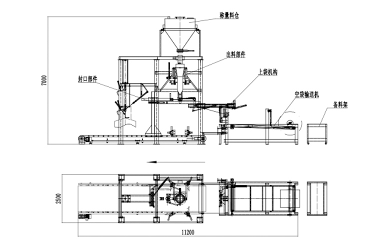 全自動機器上袋氧化鋁噸袋包裝機主要機構:氧化鋁空袋輸送機構、自動上袋機構、氧化鋁自動稱量機構、氧化鋁自動灌裝機構、自動熱合封口、自動噴碼打印、氧化鋁自動輸送機構。簡略圖紙如下: