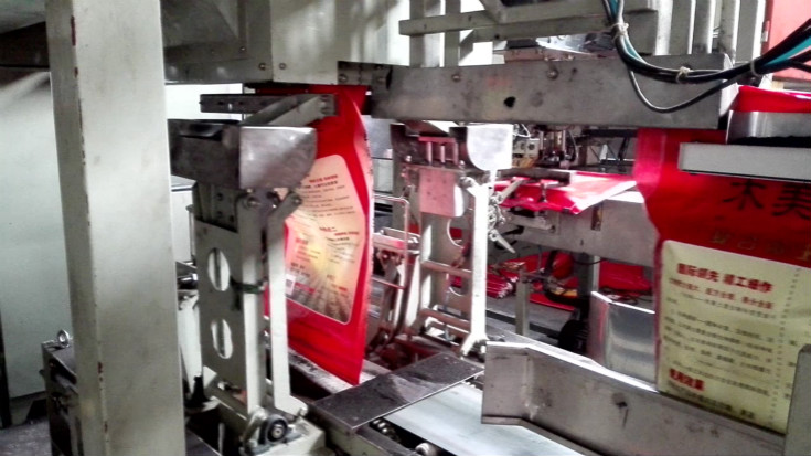 此圖片為全自動(dòng)包裝秤生產(chǎn)線中自動(dòng)定量包裝機(jī)自動(dòng)對(duì)物料進(jìn)行稱重填充到包裝袋中,整袋裝置將包裝袋整齊輸出到折邊縫口機(jī)處。