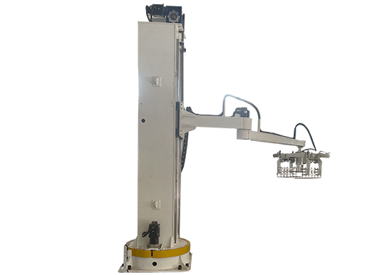 立柱機器人碼垛機的運作流程是將包裝好的物料通過輸送機送至碼垛制定區定位,立柱機器人通過各軸配合,將夾具運行至物料定位的正上方,當物料定位信號發出時,夾具通過伺服電機控制運動向 下即Z軸向下運動,達到夾具夾持物料高度時,Z軸停止下降,夾具開啟,夾起物料,Z軸伺服電機反轉,將夾具升到安全高度后,通過客戶預設程序將物料送至碼垛位上方,Z軸下降,使物料到達放置 點,此時夾具打開,將物料碼入制定位置,重復以上動作,把整個托盤碼垛完以后,報警提示,提醒已經碼垛完成。人工叉車將碼垛好的托盤運走,放入新的托盤,重新往復動作來完成批量生產碼垛 入庫。