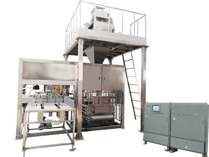 新型全自動包裝機主要有自動上袋機、自動定量稱量設備、自動折邊縫包機、自動輸出設備組成。全自動包裝機主要完成被包裝物料的自動上袋、對物料的重量進行自動稱重并填袋、輸送機將填充好的包裝袋輸送到折邊縫包處對包裝袋進行自動折邊縫包,后由輸送機將包裝袋輸送到碼垛機處進行碼垛作業。整個過程全部由全自動包裝機自主完成,中間不需要人工參與。真正實現解放生產力,降低企業成本。該全自動包裝機已獲得國家實用新型發明專利,并獲得多項技術專利,獨有的包裝機除塵裝置,使企業生產環境更加舒適。